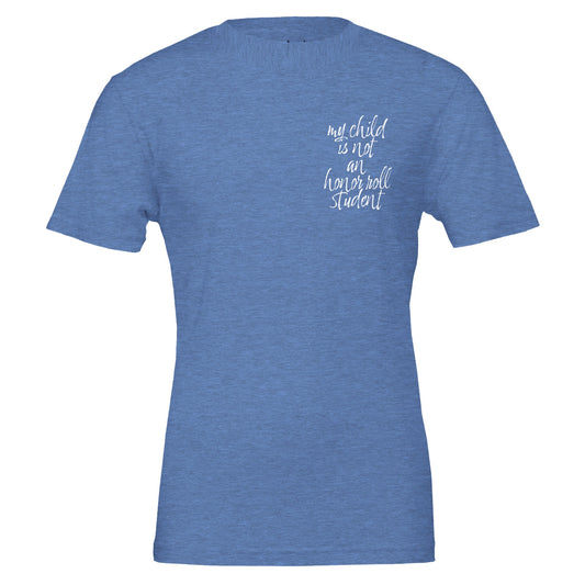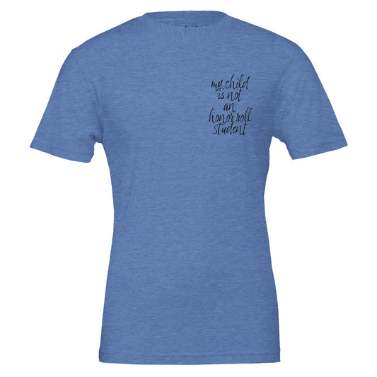 my child is not an honor roll student tee. left chest logo. large back logo. black text.