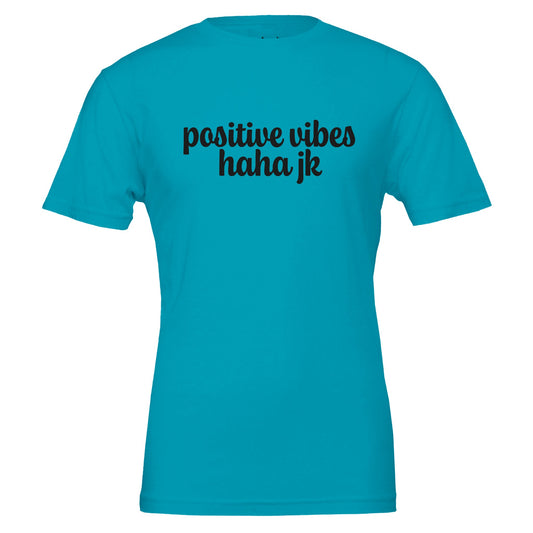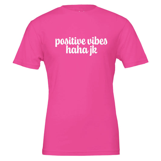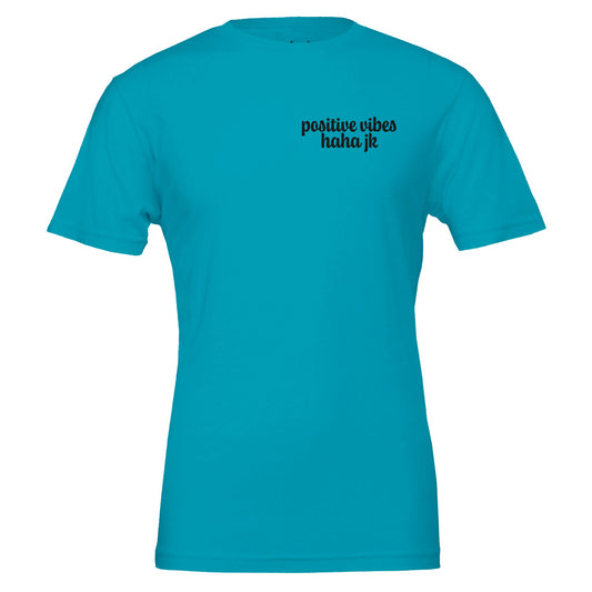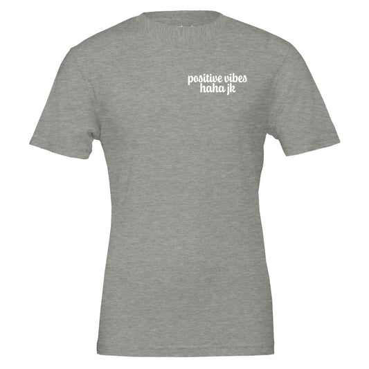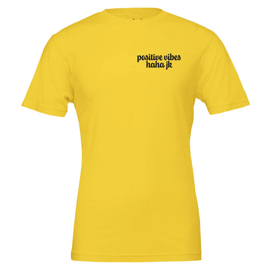 positive vibes haha jk tee. left chest logo. large back logo. white text.