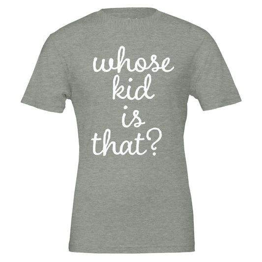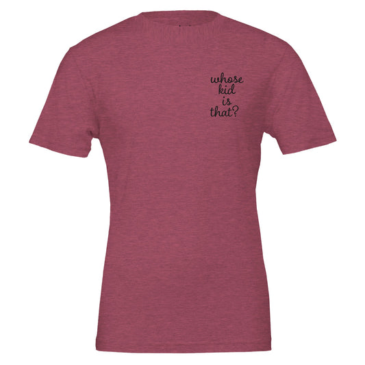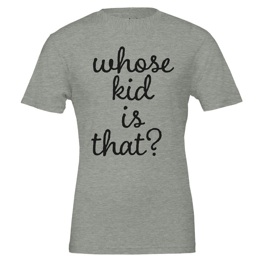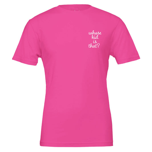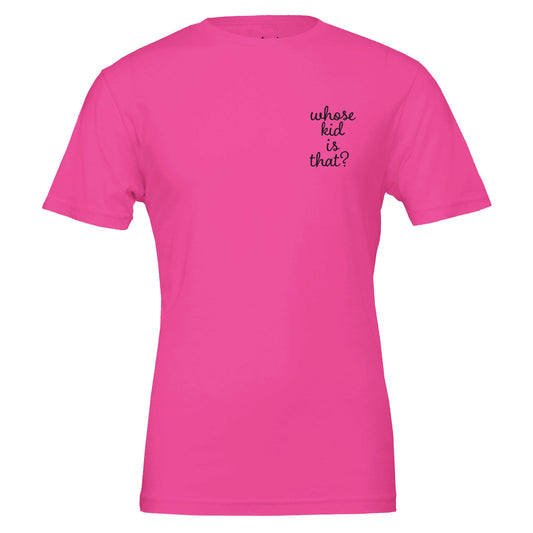 whose kid is that? tee. left chest logo. large back logo. black text.