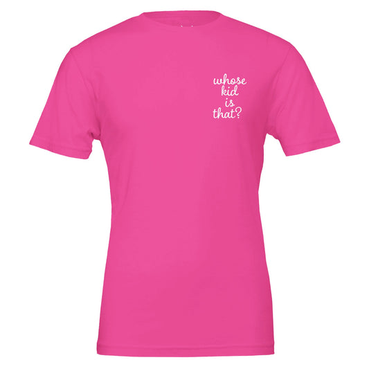 whose kid is that? tee. left chest logo. large back logo. white text.